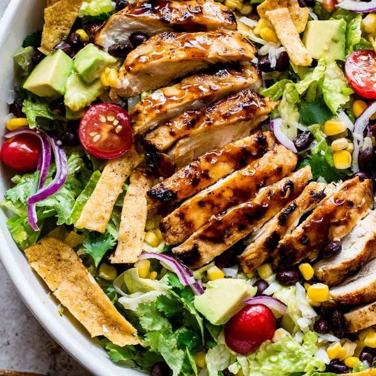- Drizzle dressing over the salad, toss gently, top with sliced chicken, tortilla strips, and fresh cilantro